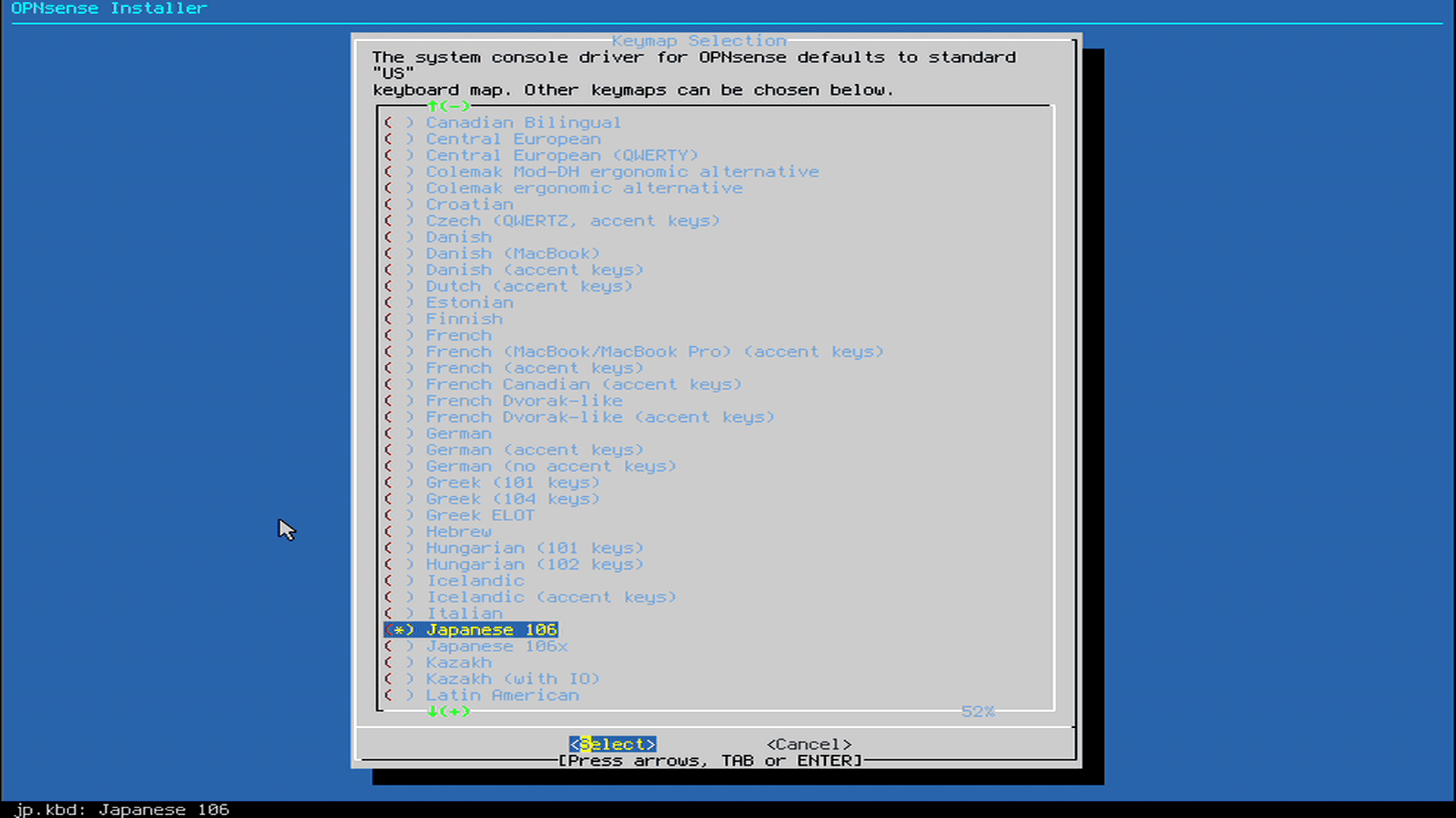Japanese 106を選んだらContinue with jp.kbd keymapを選んで次に行きます。