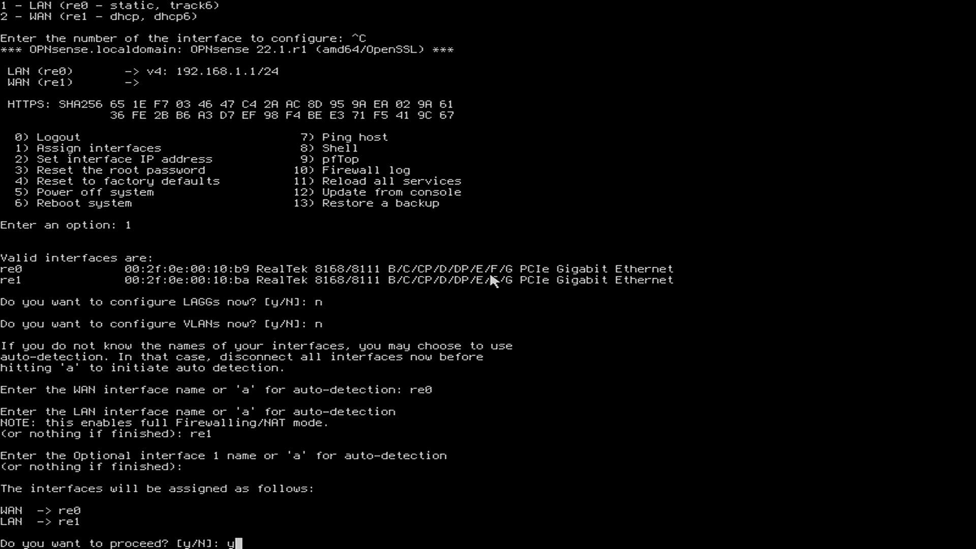 私の場合はre0をWANにre1をLANにしたいのでその設定をします。